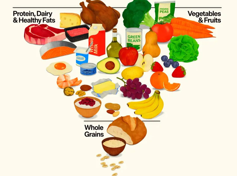 插图显示了《2025-2030 年美国人膳食指南》中引入的倒置食物金字塔,该指南更加重视蛋白质、乳制品、水果、蔬菜和脂肪,同时减少了谷物的作用。